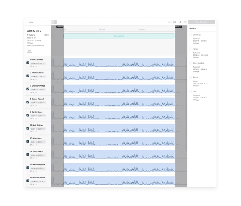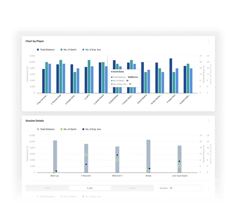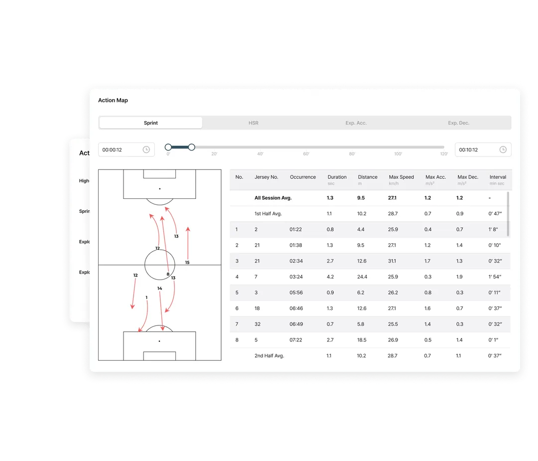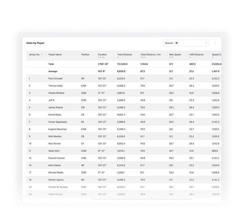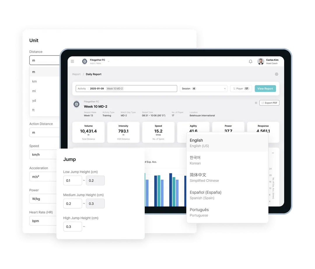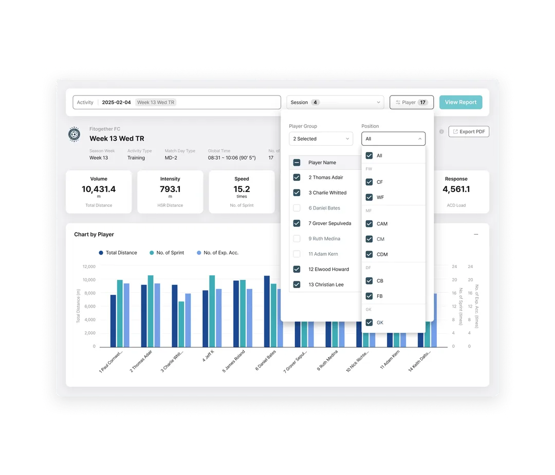 Built as one of the few truly cloud-native platforms in elite sport, Analytics enables teams to structure, analyze, visualize, and reuse performance data with ease. Powered by Fitogether’s fully cloud-native architecture, data from Cell devices is centrally stored and deeply analyzed. Training and match data are organized to support objective evaluations for individuals and teams, with customizable metrics reflecting each player’s unique profile.