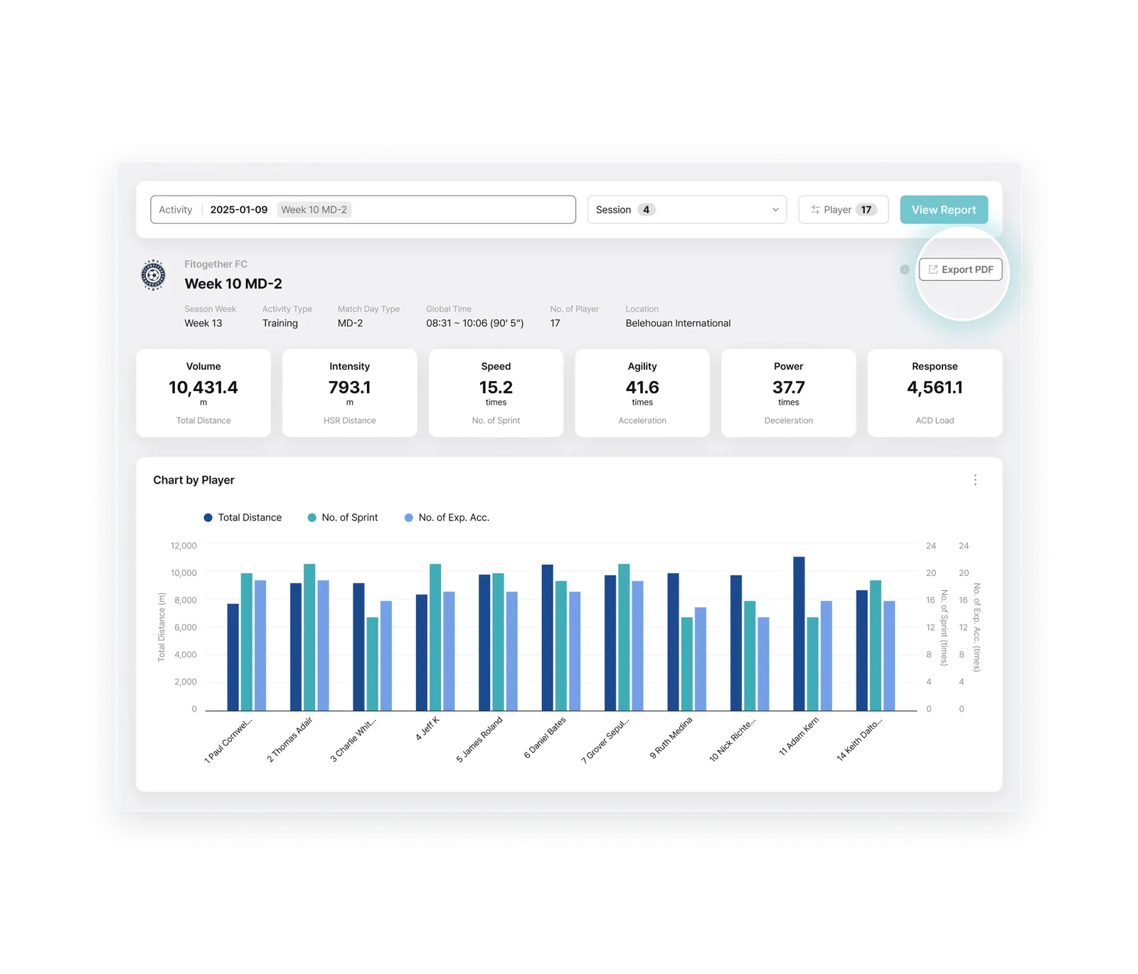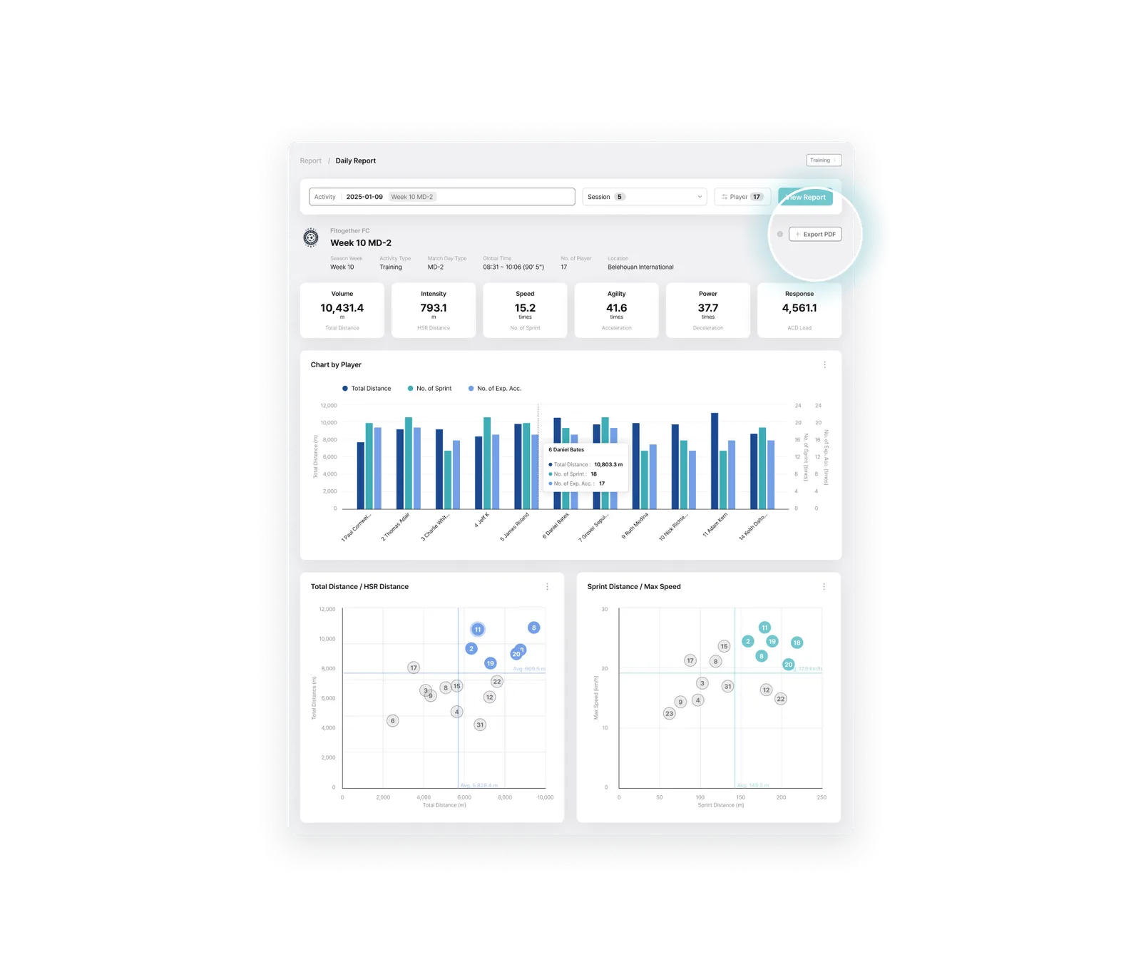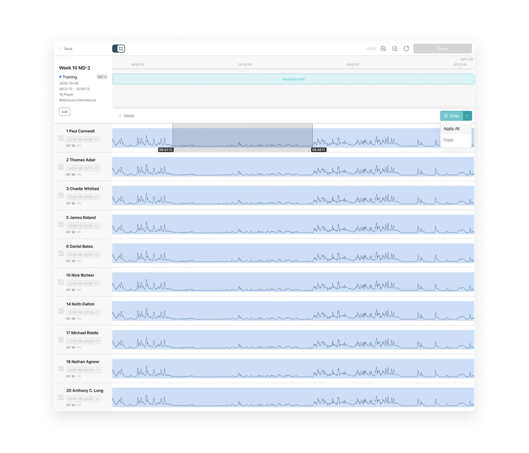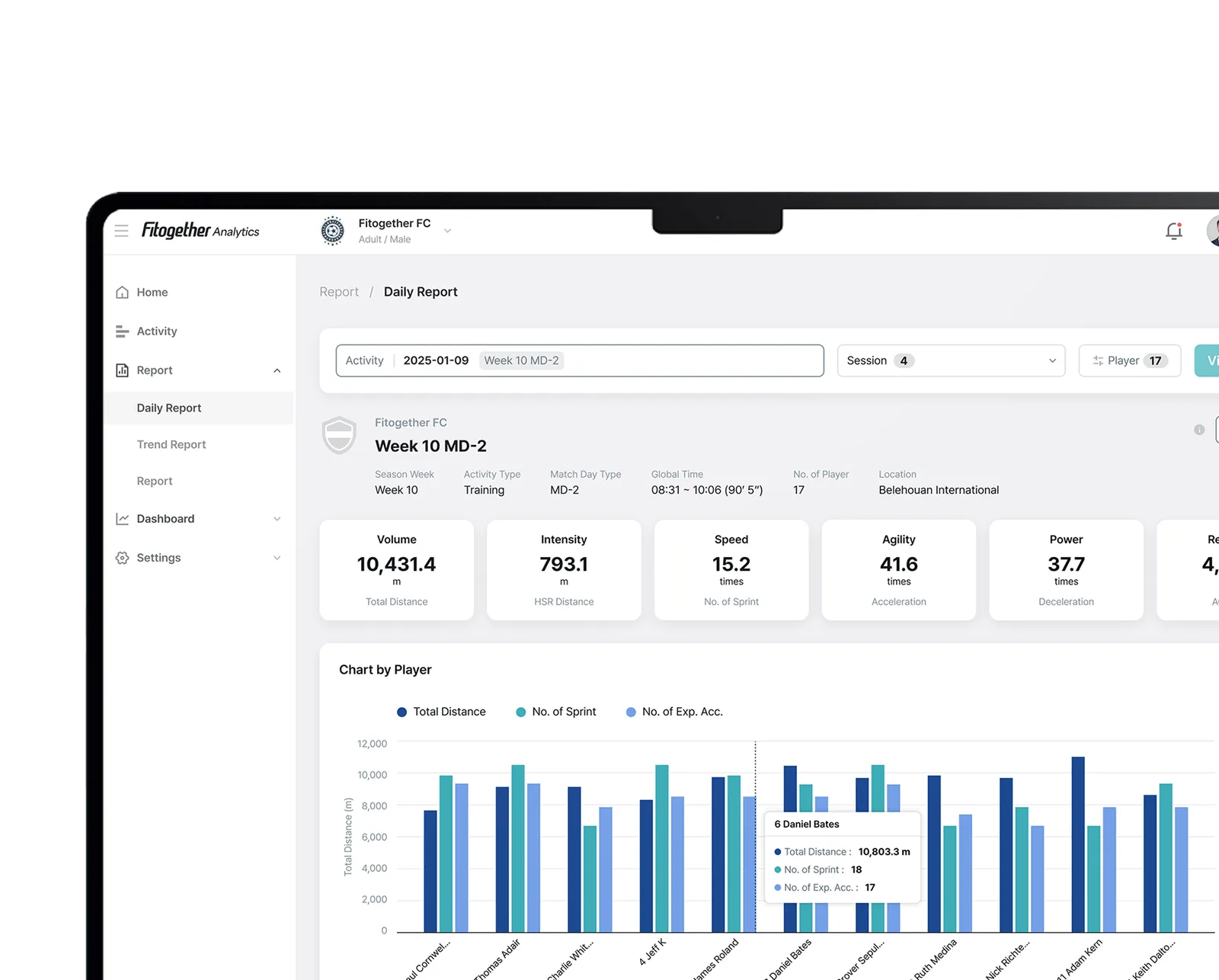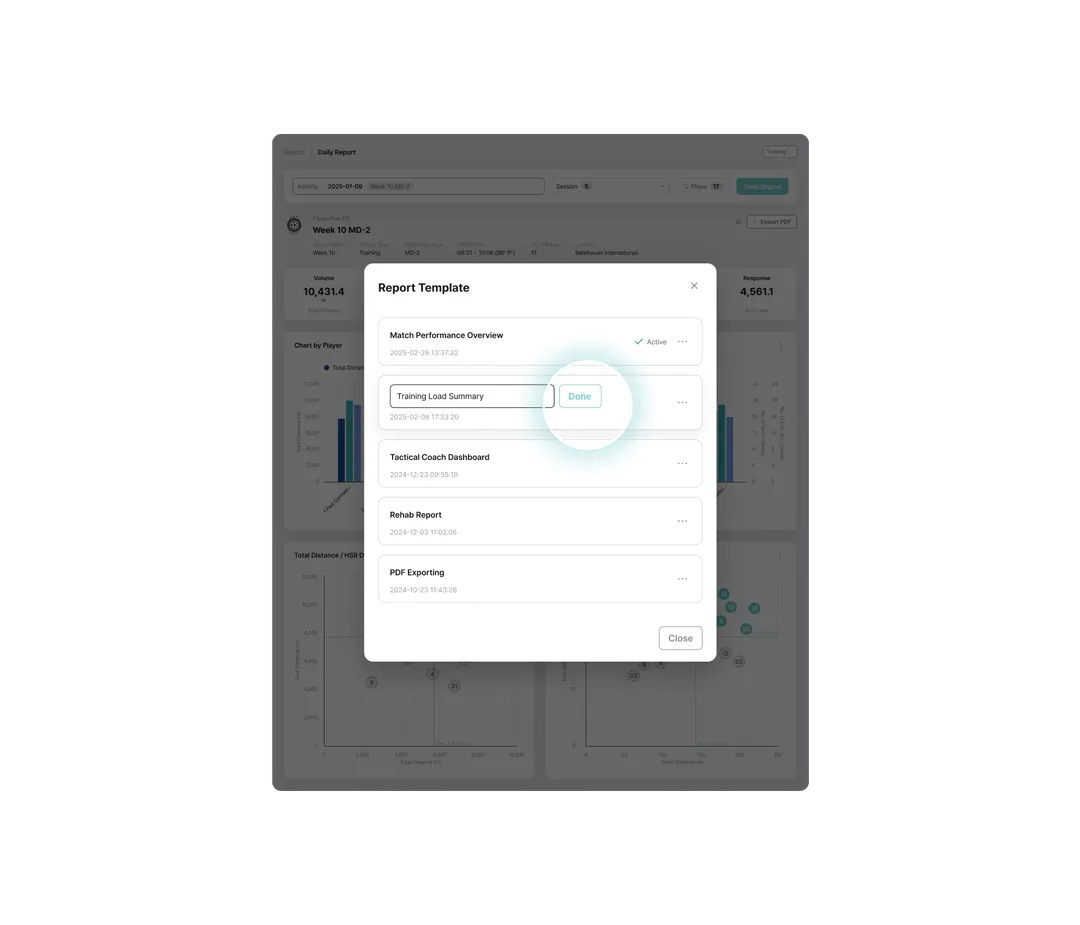 Built as one of the few truly cloud-native platforms in elite sport, Analytics enables teams to structure, analyze, visualize, and reuse performance data with ease. Powered by Fitogether’s fully cloud-native architecture, data from Cell devices is centrally stored and deeply analyzed. Training and match data are organized to support objective evaluations for individuals and teams, with customizable metrics reflecting each player’s unique profile.