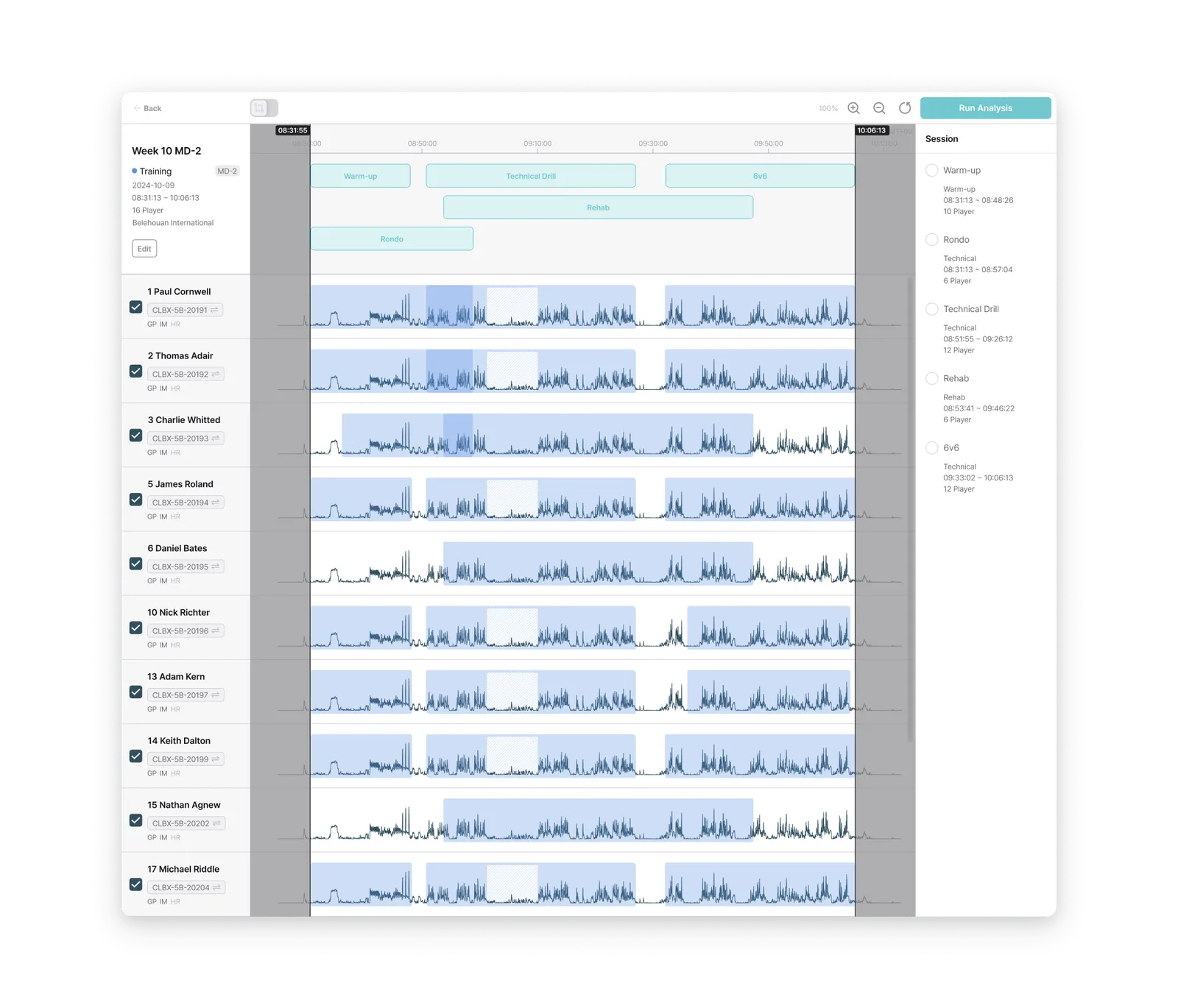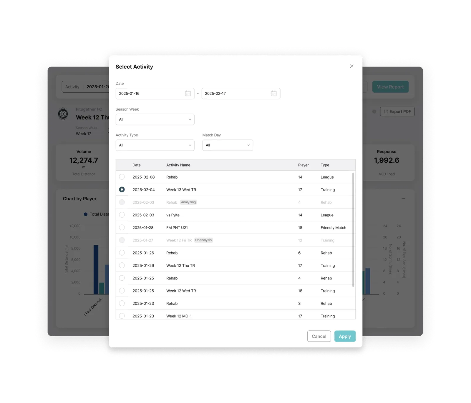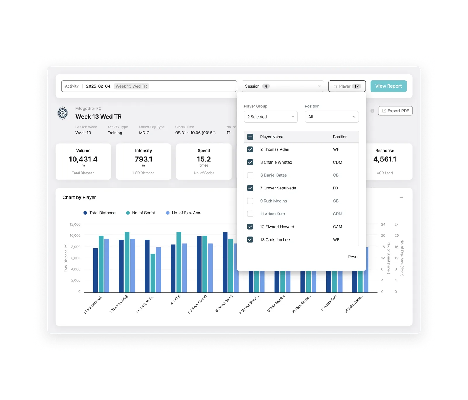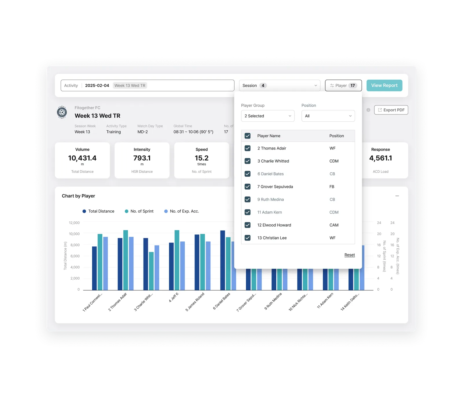 Activity Type Filtering: Choose data use, such as matches, tactical training, or recovery