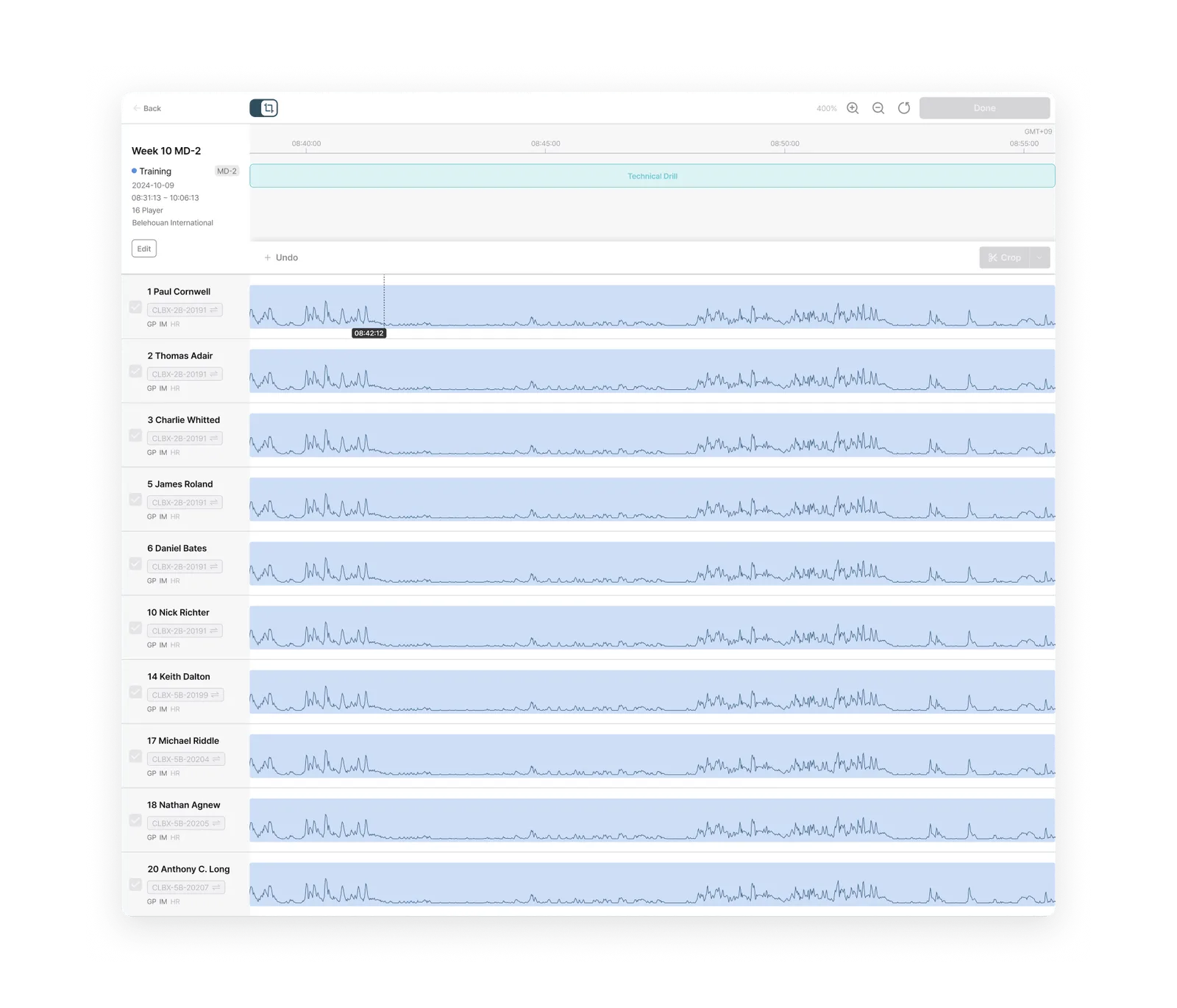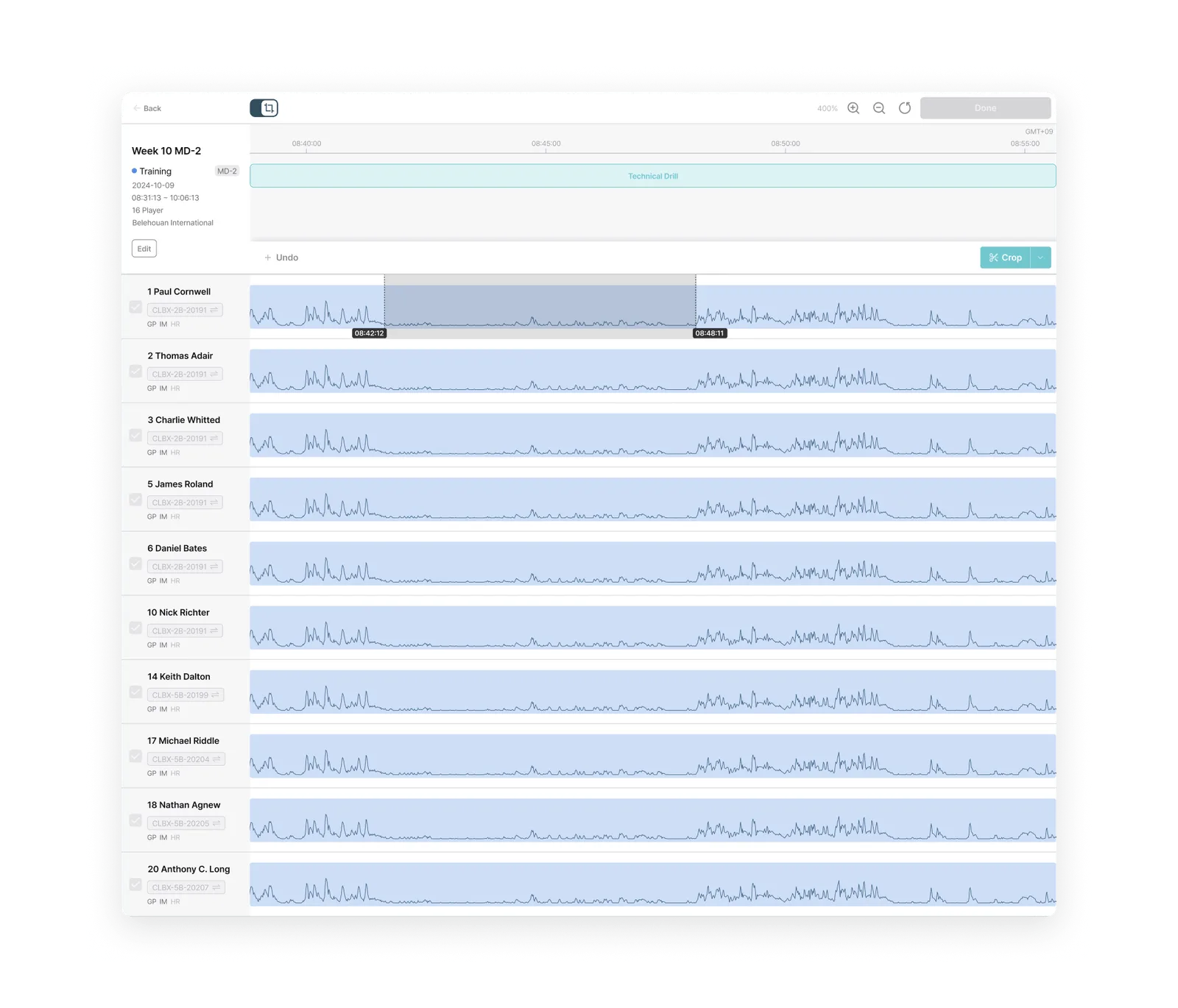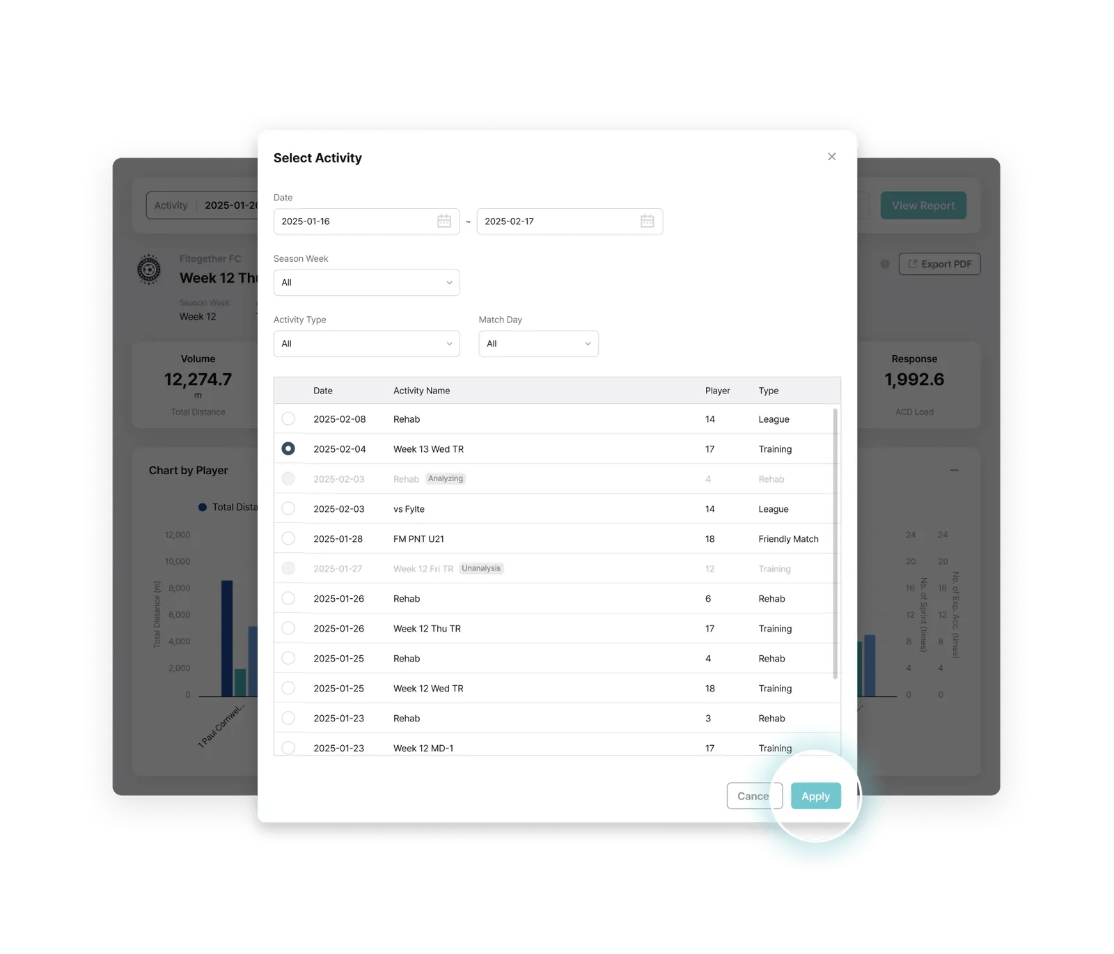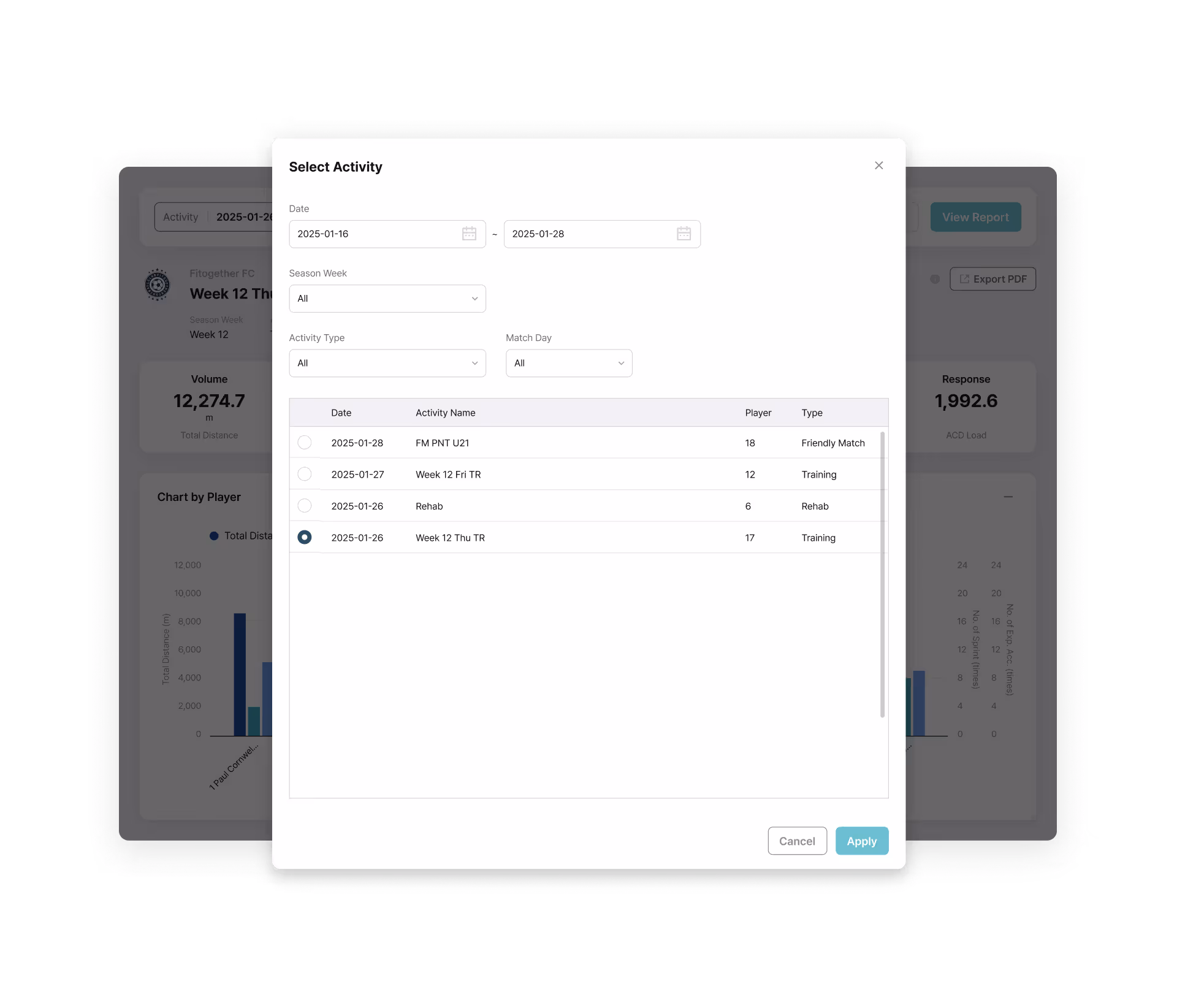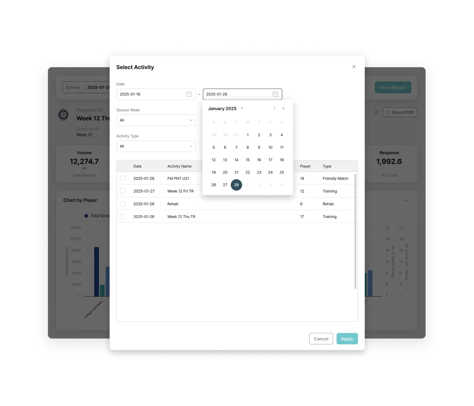 Activity Type Filtering: Choose data use, such as matches, tactical training, or recovery