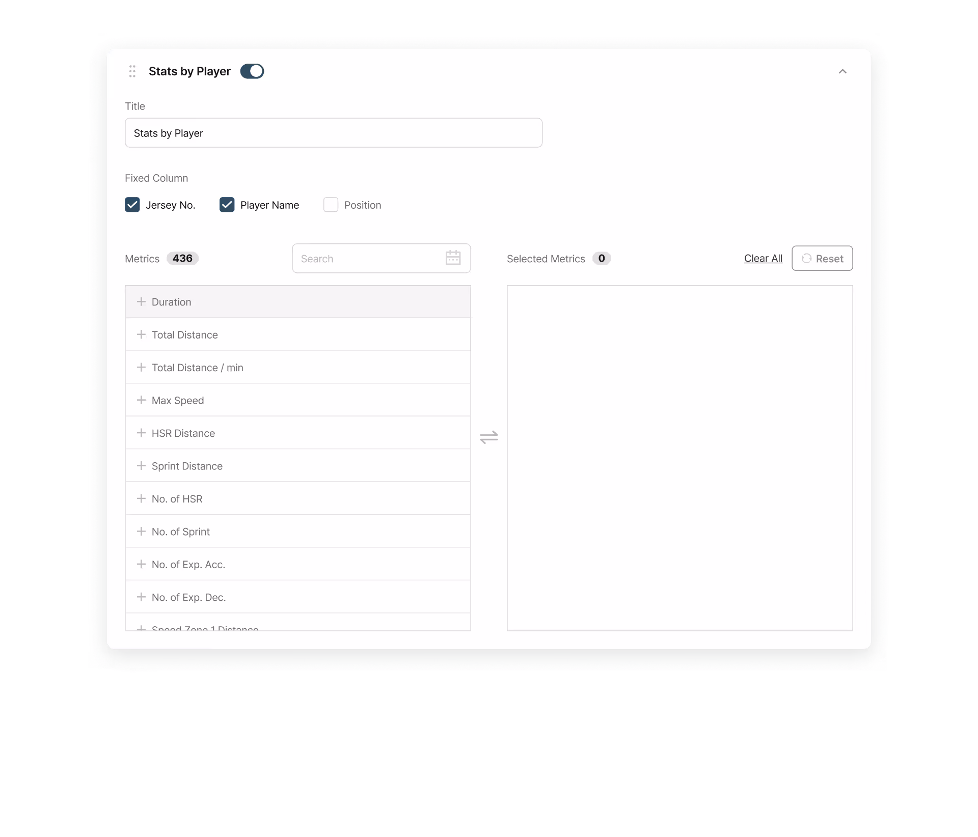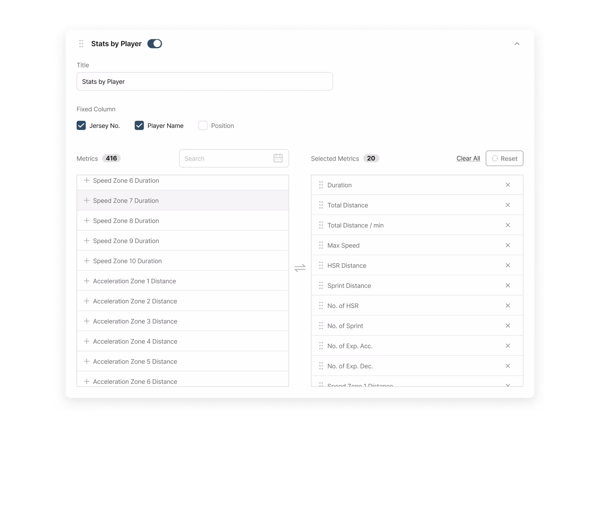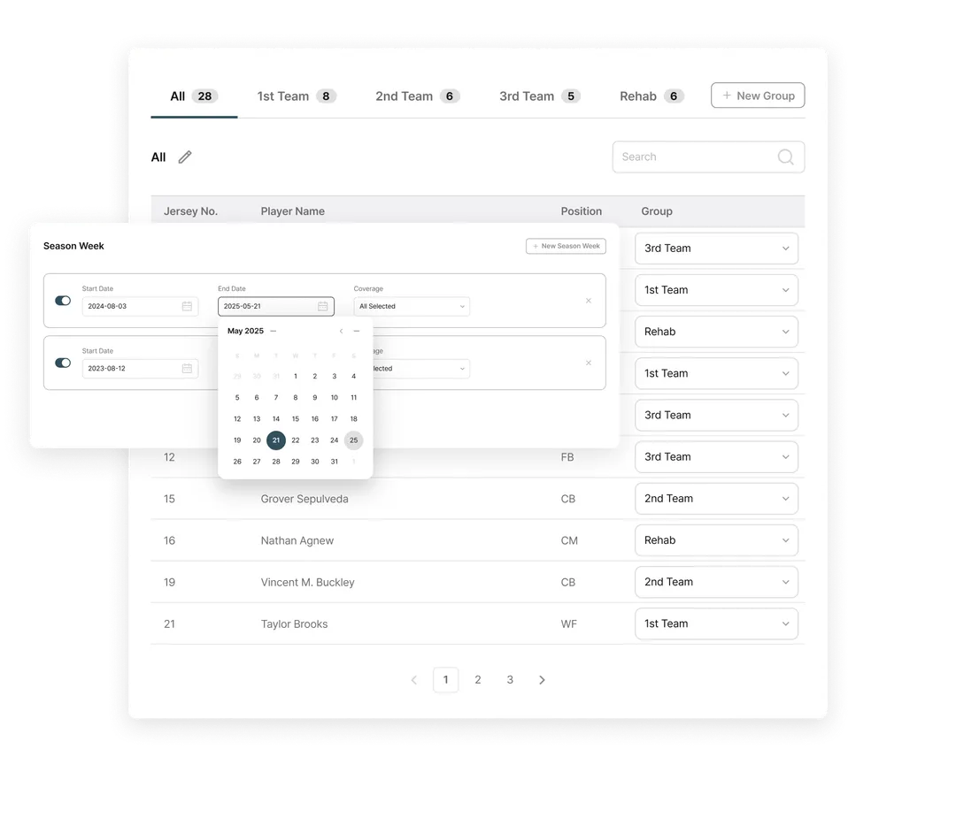 Player Grouping: Organizes data by position groups or specific player groups