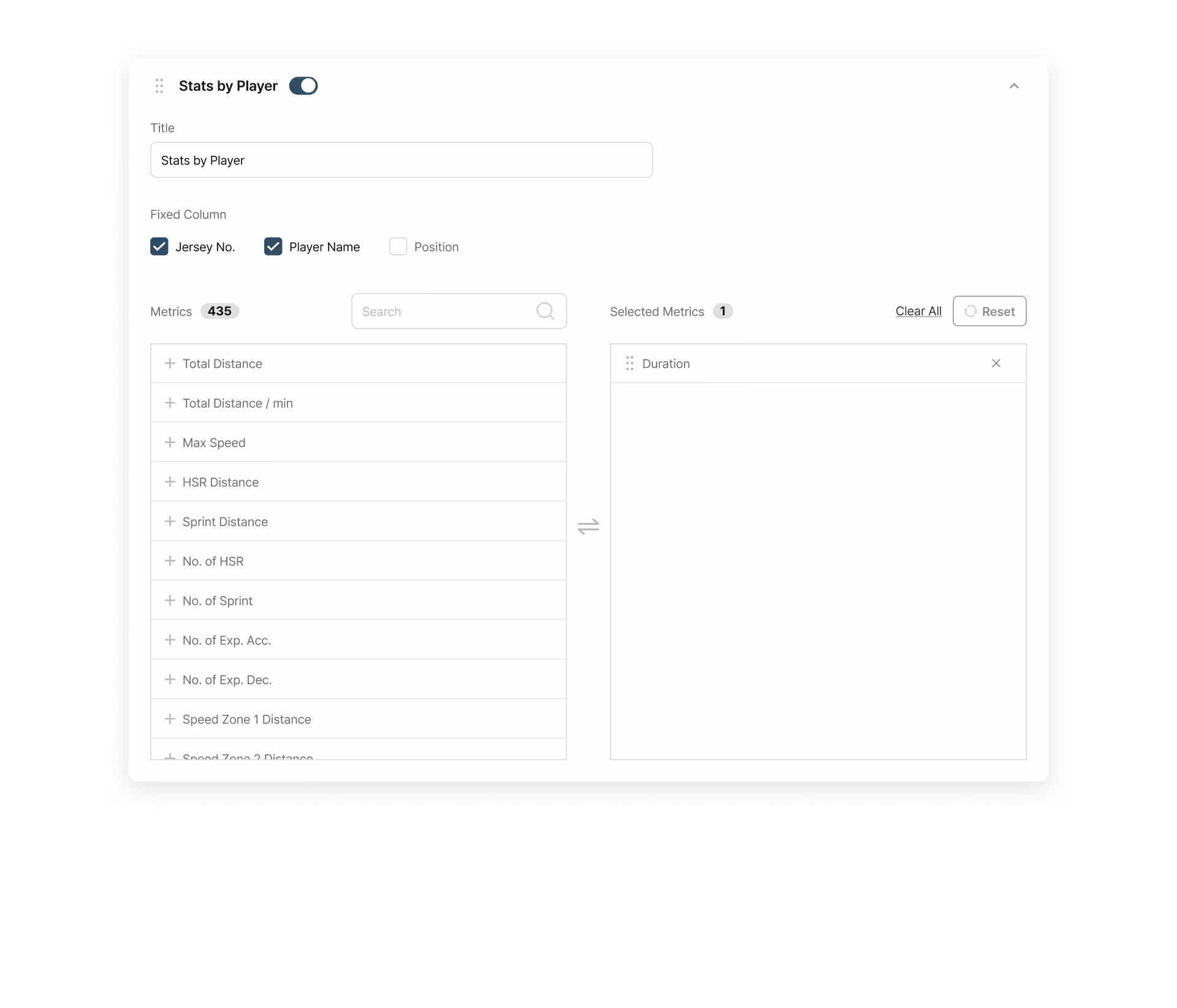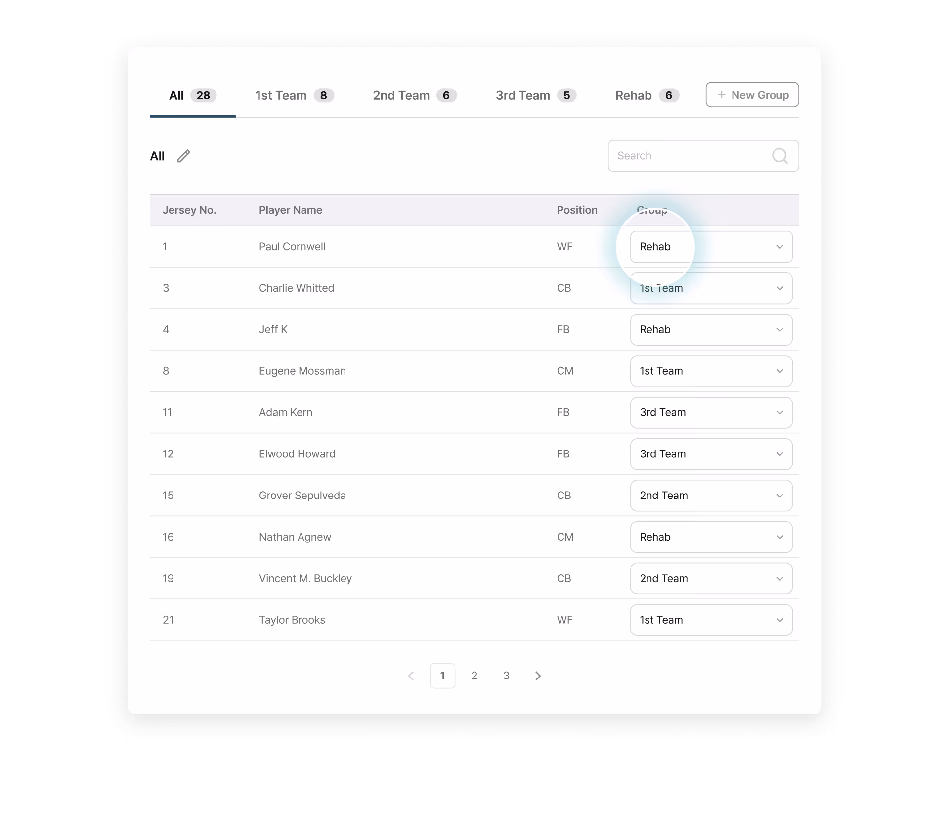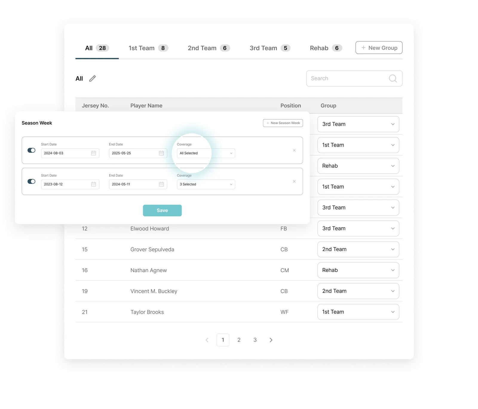 Player Grouping: Organizes data by position groups or specific player groups
