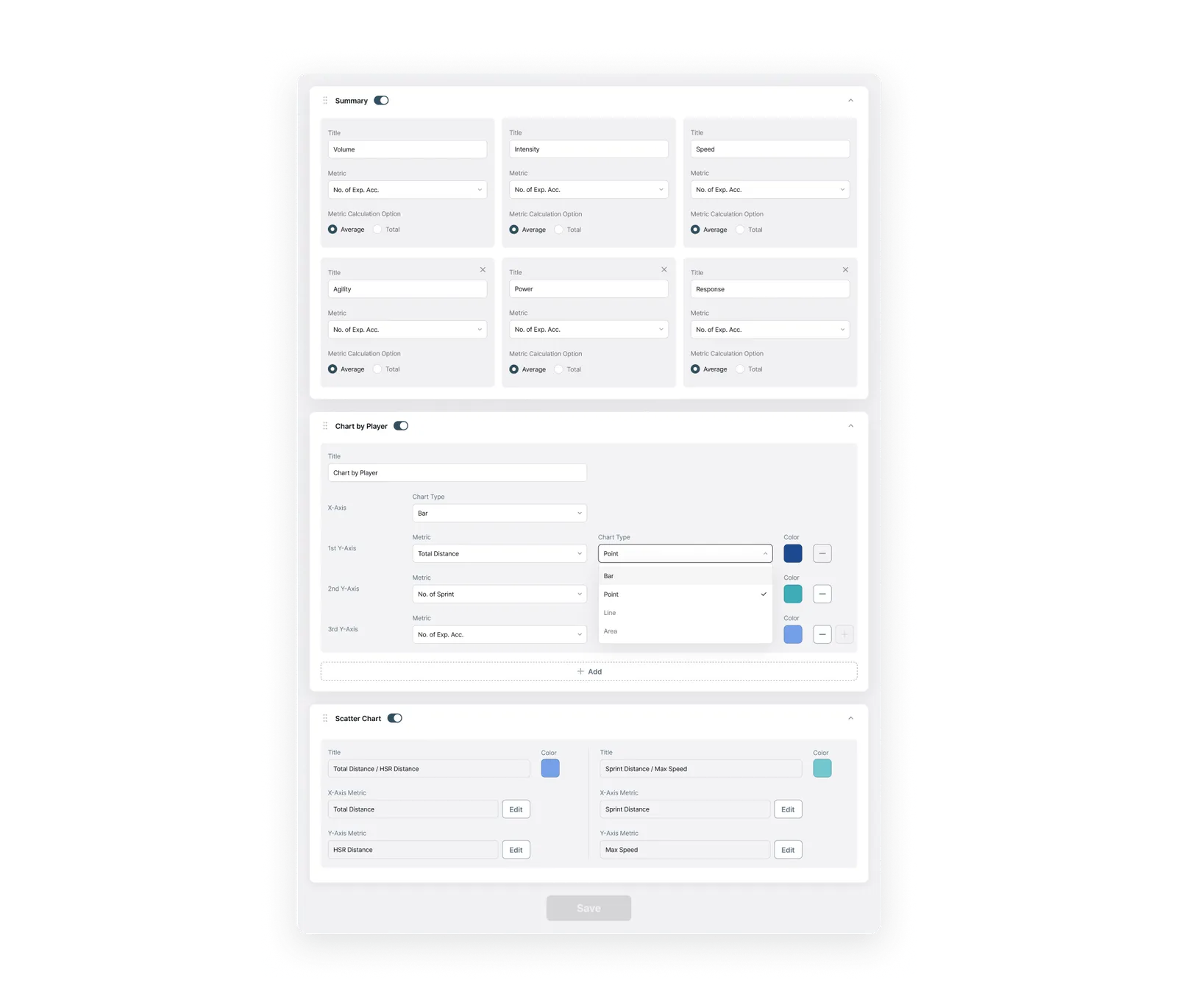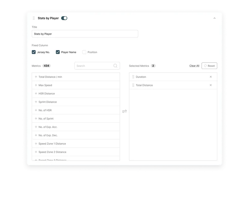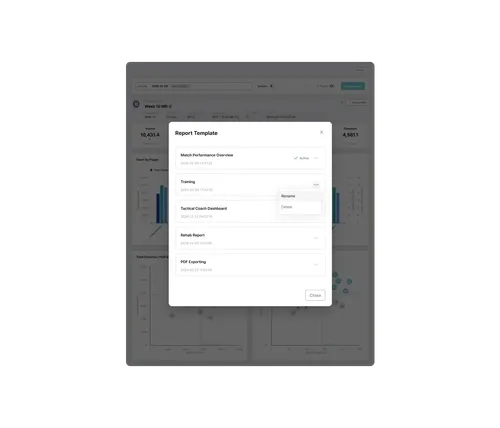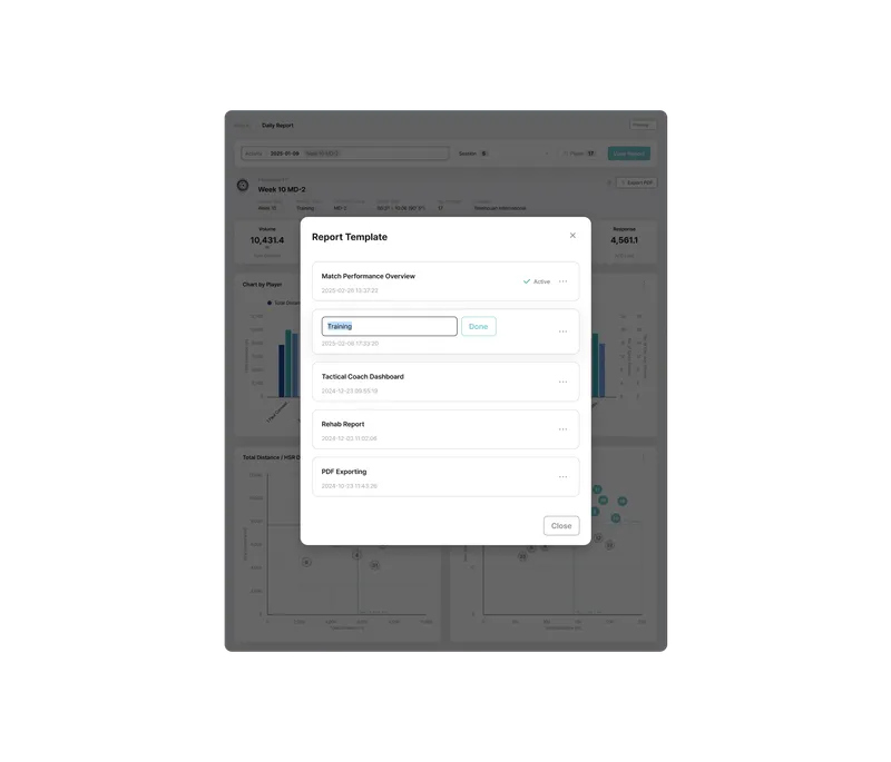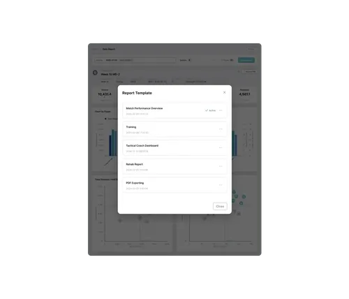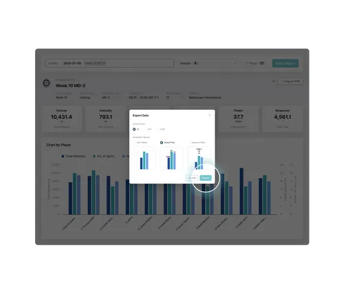 Users can adjust chart types, metric order, and indicators to match analysis needs. Frequently used settings can be saved as templates for fast, consistent reporting. API and export tools simplify integration with club data systems or dashboards.