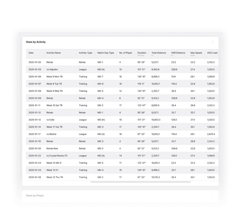 Training & Match Categorization: Sorts data by matches, training, or recovery